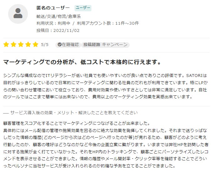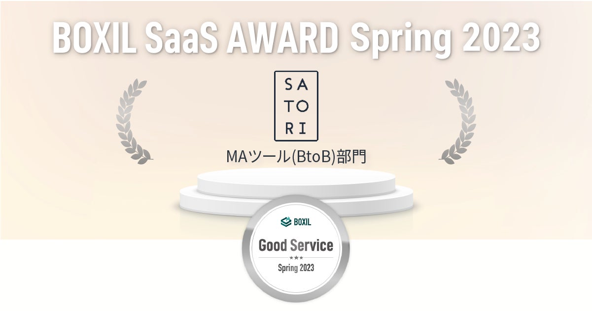 「BOXIL SaaS AWARD(ボクシル サース アワード)」は、SaaS比較サイト「BOXIL SaaS(ボクシル サース)」を運営するスマートキャンプが、優れたSaaSを審査、選考、表彰するイベントです。今回の「BOXIL SaaS AWARD Spring 2023」は、2022年1月1日から2022年12月31日までの1年間で新たに投稿された口コミ約14,000件を審査対象としており、「SATORI」は「MAツール(BtoB)部門」で「Good Service」に選ばれました。